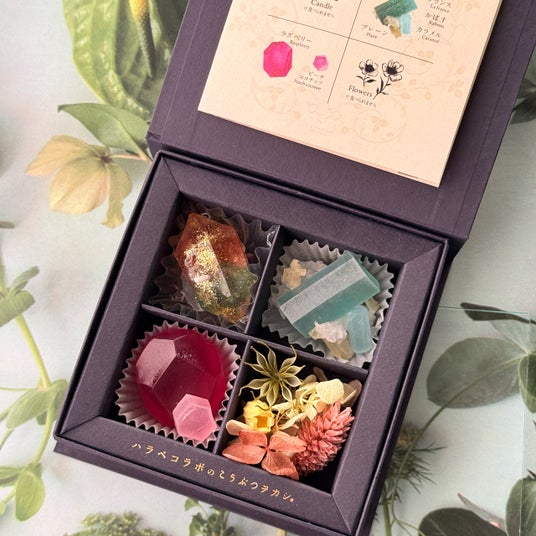 「ルビーちゃんとエメラルドちゃんのこうぶつヲカシ 4粒箱」は、ルビーとエメラルドの原石をイメージしたこうぶつヲカシ2粒に、やわらかな灯りを楽しめる鉱物型ジェルキャンドルとドライフラワーを添えた、コンパクトなギフトセットです。箱を開けた瞬間にときめく可愛らしさはそのままに、9粒箱よりもお求めやすい価格とサイズ感で、気軽な贈り物や他のプレゼントに添える“プラスワンギフト”としてもおすすめ。お母さんへ日頃の感謝をさりげなく伝える、母の日の贈り物にぴったりの一箱です。【商品概要】