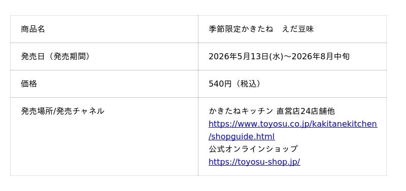 とよす株式会社(本社:大阪府池田市 社長:眞田 昌彦)は、百貨店を中心に展開しているブランド「かきたねキッチン」において、『季節限定かきたね えだ豆味』を2026年5月13日(水)から期間限定で発売いたします。