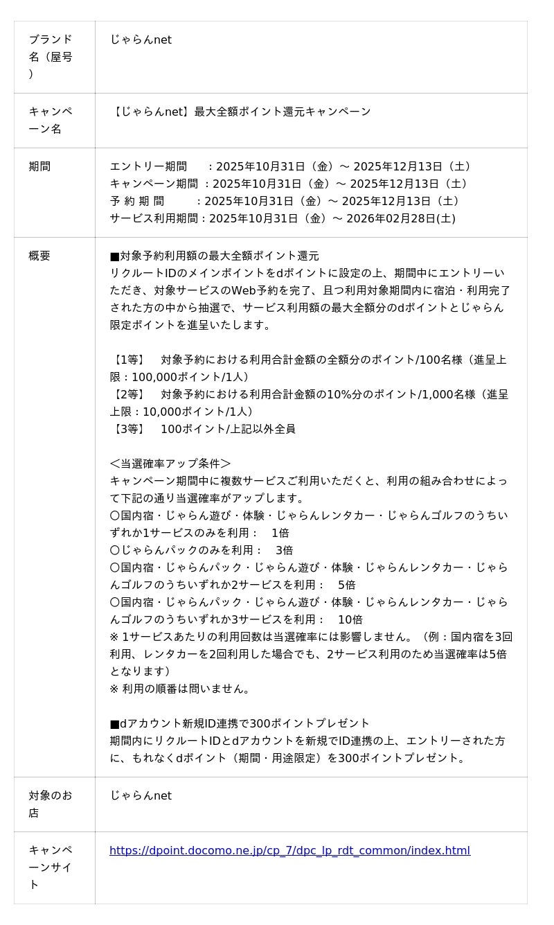 株式会社NTTドコモ(以下、ドコモ)は、じゃらんnetにおいて、「最大全額ポイント還元キャンペーン(以下、本キャンペーン)」を2025年10月31日(金)から2025年12月13日(土)まで開催いたします。