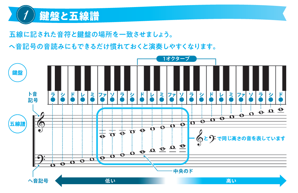 まずは、鍵盤と五線譜の解説からスタート。初めて鍵盤楽器に触れる人でもスムーズに学び進められます。また、初心者で、一番苦労するのが譜読みです。そのため、前半は、音符のすべてにカタカナをふりました。「次の音は何?」と手を止めることなく演奏することができます。