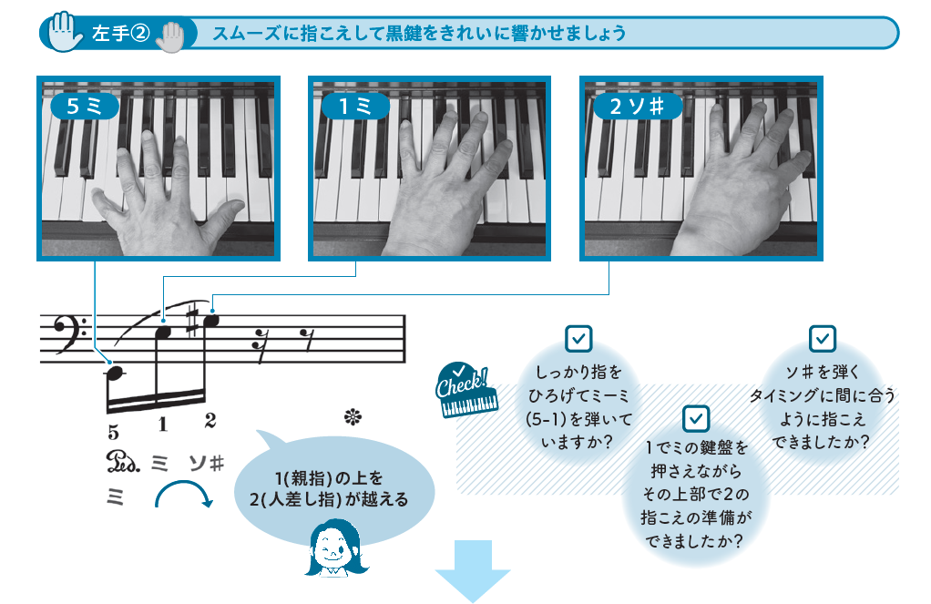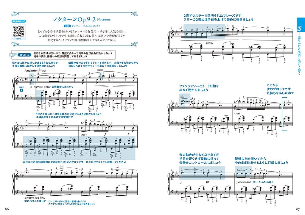 挫折しがちなポイントは動画や写真でフォロー。大事なところで講師がちゃんと語りかけてきて、最後までしっかり伴走します。ただ最後まで間違いなく弾ければ終わりではなく、人前で演奏できる表現力まで身につけることができるのが、本書の最大の特徴です。
