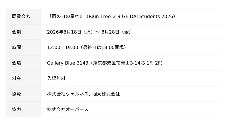 abc株式会社(本社:東京都港区、代表取締役:松田元、証券コード:8783、以下「当社」)は、南青山にて2026年8月に開催されます、Rain Tree 橋本真希 × 藝大生9人によるコラボレーション展『雨の日の星空』への協賛を行っております。