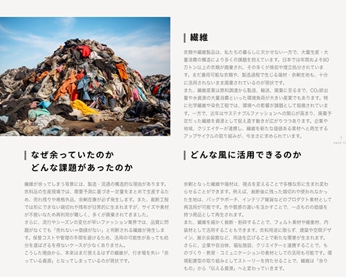 単なる製品紹介にとどまらず、素材の背景やストーリーまで含めて可視化することで、アップサイクルへの理解を深めることを目的としています。