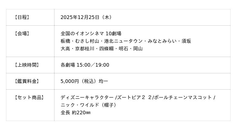 本上映会では、全世界で大ヒット公開中の『ズートピア2』の本編上映に加え、『ズートピア』の人気キャラクター、ニック・ワイルドの イオンシネマオリジナル『ボールチェーンマスコット』がセットになったイオンシネマ限定企画です。ぜひご家族やご友人と一緒にお楽しみください。