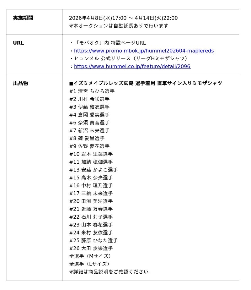 株式会社モバオク(本社:東京都渋谷区、代表取締役社長:小一原 宏樹、以下モバオク)が運営するオークションサービス「モバオク」にて、株式会社エスエスケイが実施する国際女性デーを記念したチャリティーオークション「イズミメイプルレッズ広島×ヒュンメル ミモザシャツ チャリティーオークション」を、2026年4月8日(水)から開始いたします。