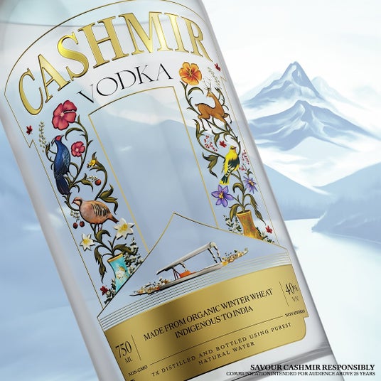 「Cashmir Vodka (カシミール・ウオッカ)」が使用する原料は2000年以上前からインド・パンジャーブ地方で受け継がれてきた有機古代小麦のみ「Sona Moti(ソナ・モティ=黄金の真珠)」。このウオッカは、カシミール渓谷に源を発する純粋な氷河水を使用して造られています。この水は天然のミネラル分を豊富に含み、汚れを知らない透明度で知られており、ウオッカのなめらかでキリッとした特徴を生み出しています。