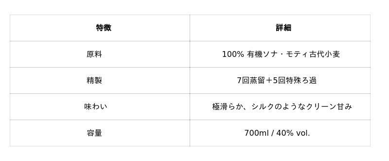 古代小麦「ソナ・モティ」と7回蒸留で実現したシルクのような飲み口。
