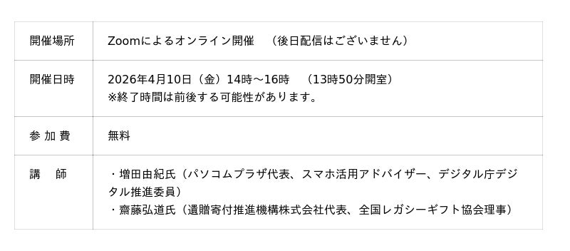 公益財団法人日本対がん協会(東京都中央区築地、会長・垣添忠生)は、オンライン終活セミナー「始めましょう デジタル終活~暮らしや資産の終活と遺贈寄付~」を、2026年4月10日(金)に開催します。