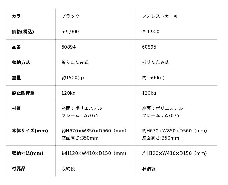 軽量化を実現するために採用されたのは、航空機部品にも使われるA7075アルミ合金(通称:超々ジュラルミン)。軽さと強度を兼ね備えた素材で静止耐荷重は120kg。アウトドアの過酷な環境でもしっかり体を支えます。