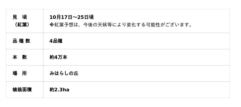 コキアはヒユ科ホウキギ属で、ユーラシア大陸の乾燥地帯原産の一年草。和名の「ほうき草」は、かつて枝や茎を乾燥させて、ほうきを作っていたことに由来します。みはらしの丘に植栽している観賞用の品種「ルージュ」は、丸々とした草姿に成長し、季節の移ろいとともに緑から赤へと色合いが変化していくのが魅力です。6月5日から植え付けを始めたコキアは、植え付けから約4ヶ月の時を経て、ついに「紅葉見頃」を迎えました。