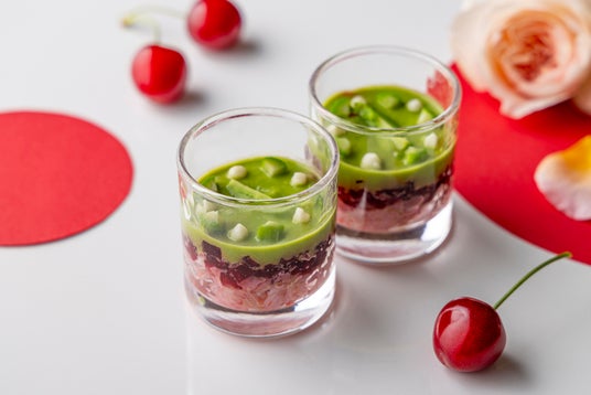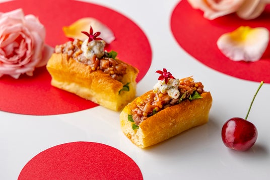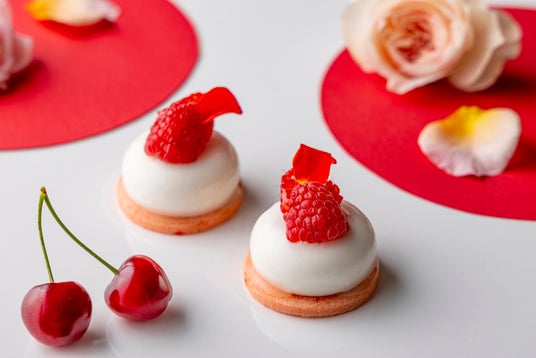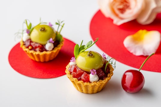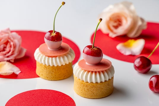 見た目の愛らしさと、はじけるような甘みで唯一無二の魅力を放つチェリーは、古くから幸福の果実として神話にも描かれ、人々に親しまれてきました。その一方で、初夏のわずかな時期にだけ出会える、季節の訪れを告げる特別な果実でもあります。一年を通してさまざまな食材を楽しめる現代だからこそ、コンラッド東京では、この時季ならではのおいしさと風情を大切にしたいという想いから、可憐なチェリーを主役に、華やかでかぐわしい初夏のバラ園から着想を得た「チェリー&ローズ アフタヌーンティー “ラ・フルール”」をご用意いたしました。真っ赤なチェリーを模ったムースや、バラが水面に浮かぶ情景を表現したグラススイーツなど、チェリーの愛らしさとバラの気品が調和するスイーツ5種と、カニやローストビーフなど厳選食材を使用したセイボリー3種をご提供。開業以来変わらぬレシピでご好評をいただいているスコーンは、プレーンに加え、チェリーの果肉を練り込んだ季節限定フレーバーが登場いたします。