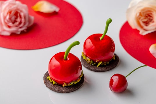 2種類のチェリーを使用し豊潤な甘みが広がるムースに、ミルクチョコレートとパッションフルーツのクリームを入れ、後味を軽やかに仕上げました。ピスタチオをアクセントにまぶし、ビターなココアクッキーが全体の味わいを引き締めます。