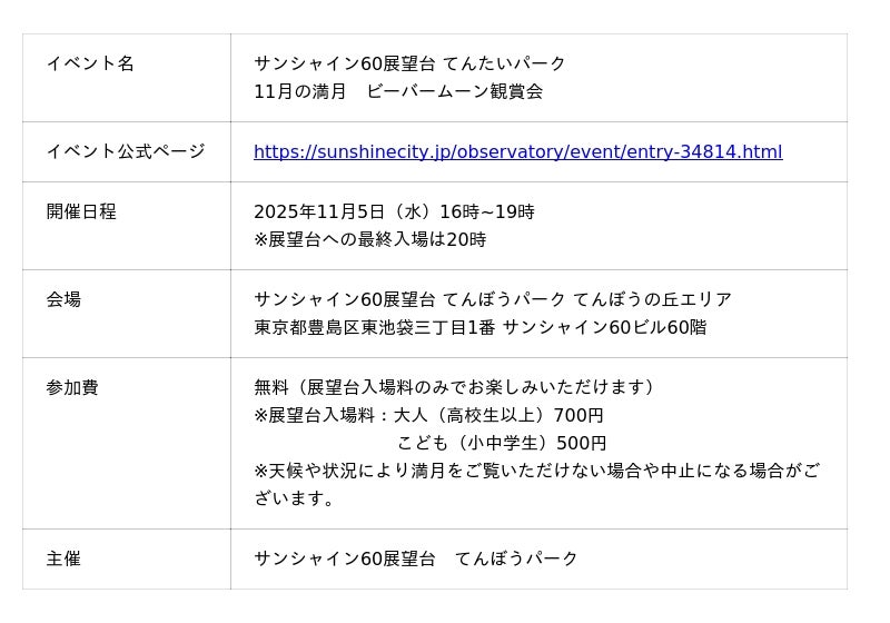 株式会社タムロンは、2025年11月5日(水)、東京・池袋の「サンシャイン60展望台 てんぼうパーク」で開催される「サンシャイン60展望台 てんたいパーク※ 11月の満月 ビーバームーン観賞会」に参加いたします。