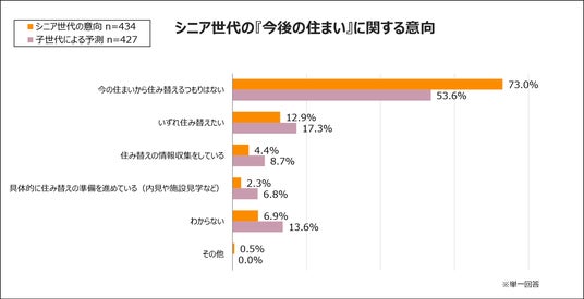 - 親が「住み替えるつもりはない」と予測する子世代は53.6%と、シニア世代の回答と約20%の開き