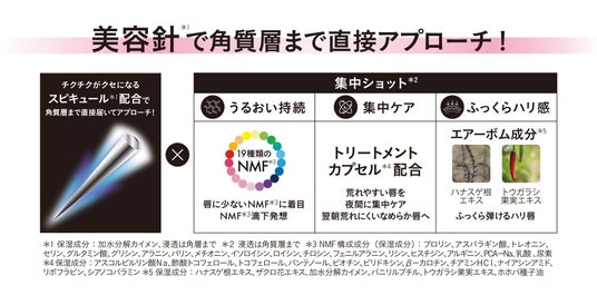 不足している栄養を補給する施術である「美容点滴」からインスピレーションを受け、唇に少ないと言われているNMF※3を配合。スピキュールで開けた穴で、NMF※3をはじめとしたうるおい成分を効率的に届けます※5。