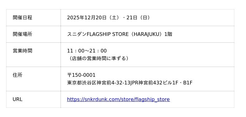 コラボレーションを記念して12月20日(土)・21日(日)の2日間、スニダンFLAGSHIP STOREにてポップアップを開催します。さらに、12月22日(月)よりスニダンアプリ内特設サイトにてオンラインでの抽選販売を実施します。