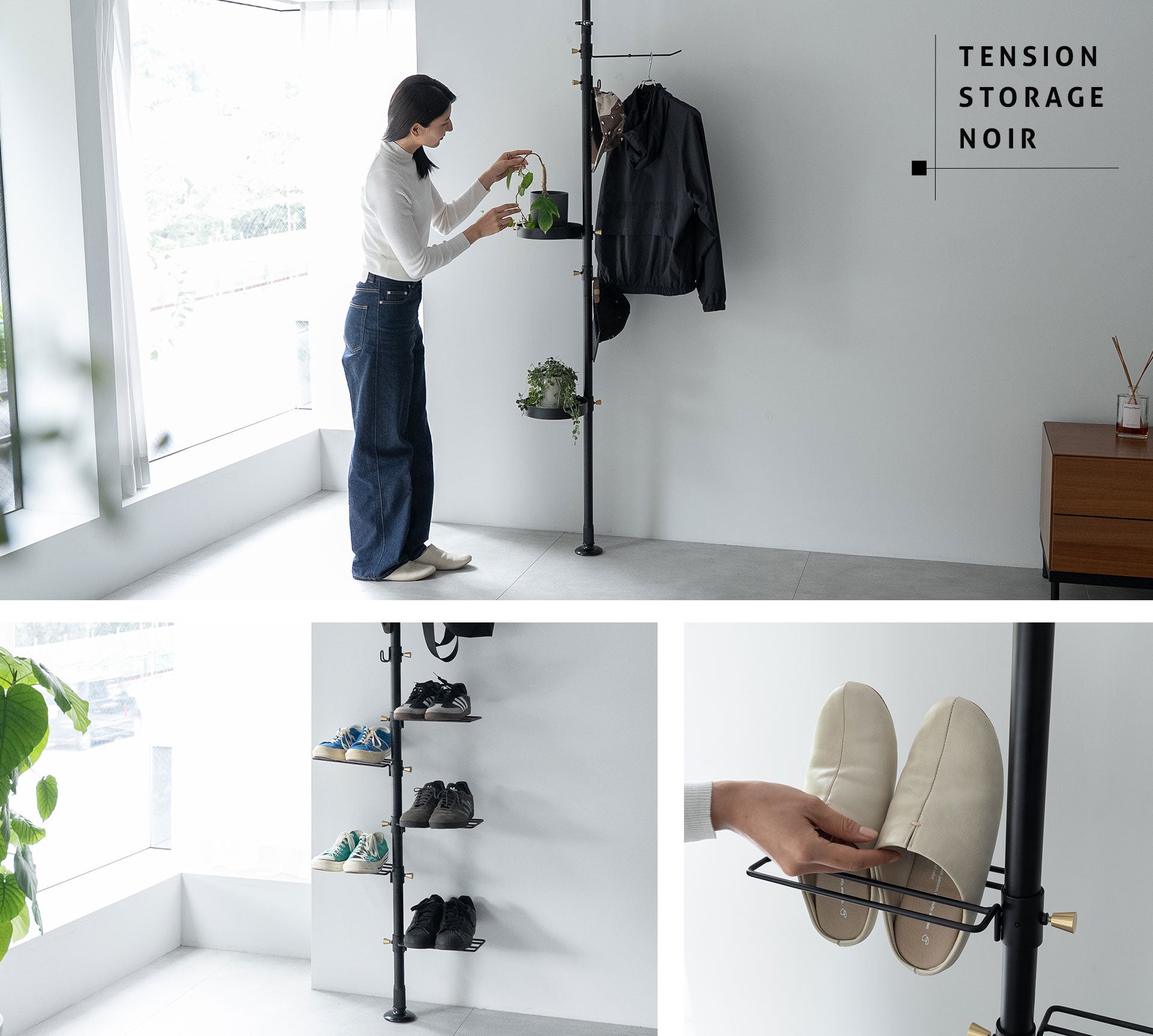 ノワールは、天井と床で突っ張る方式のポールハンガー兼収納ラックです。シックなマットブラックのスチールに、控えめに輝くゴールドの固定ネジがアクセント。