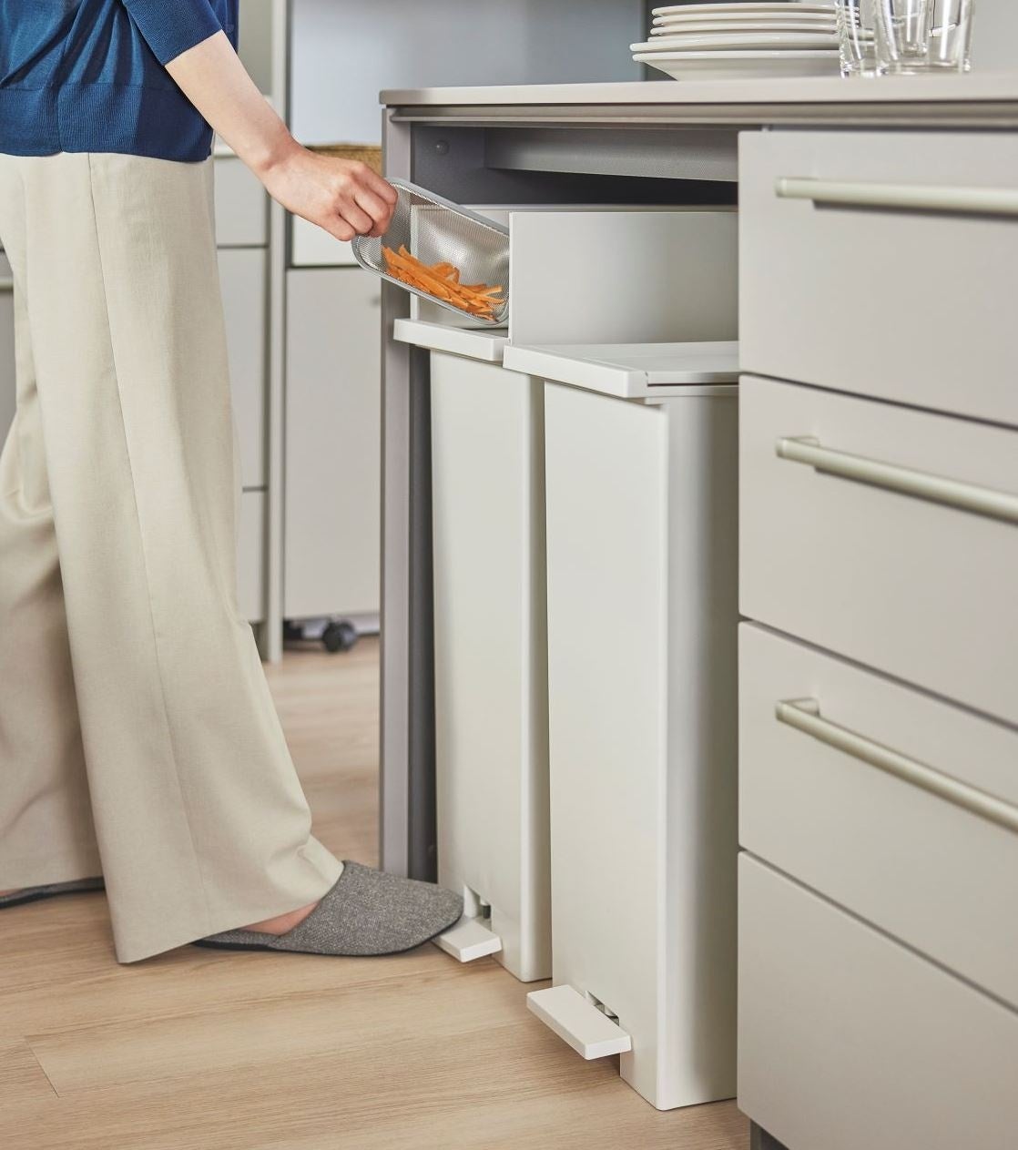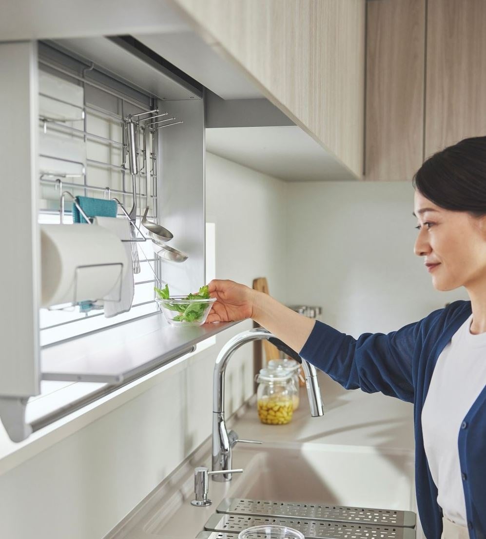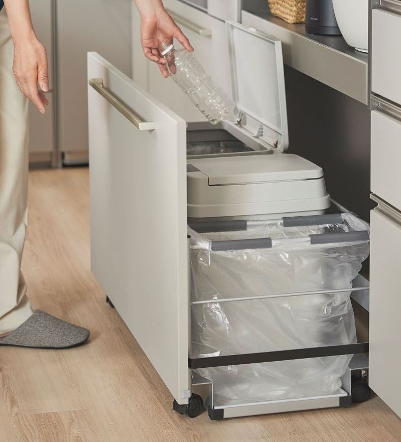 お客様の要望を踏まえ、収納アイテムも複数リニューアルしました。特にゴミ箱の収納場所に困るという意見が多く、「フルオープンキャビネット」のサイズ展開の拡充や、「ダストボックスワゴン」付属のゴミ箱を従来の1.8倍(最大36L)に変更。目の高さに降ろせる吊戸棚「アイレベル昇降キャビネット」は凹凸の少ない取手レス仕様とし、空間と調和させやすいデザインへと見直しました。