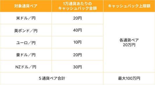 キャンペーン期間中にお申し込みいただいたお客様を対象に、「米ドル/円」「英ポンド/円」「ユーロ/円」「豪ドル/円」「NZドル/円」のお取引において、新規取引で1万通貨あたり下記の金額を最大100万円キャッシュバックいたします。各通貨ペアのキャッシュバックの上限は20万円、裁量取引(通常トレード)・自動売買取引、どちらでもキャッシュバックの対象となります。