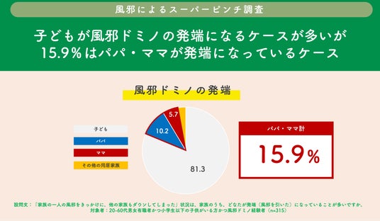 - 働くパパ・ママの8割が、家族の一人の体調不良をきっかけに、他の家族が次々にもダウンしてしまう“風邪ドミノ”を経験!- 子どもが“風邪ドミノ”の発端になるケースが多いが、15.9%はパパ・ママが発端になっているケースも!