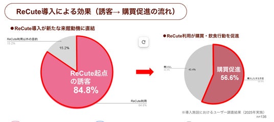 実際に導入済みの施設では、利用者の約8割が「ReCuteを目的に来館した」と回答しており、さらにその内の半数以上が施設内での買い物や飲食を併せて行っています。