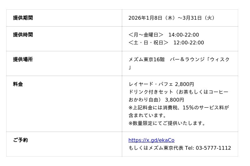 東京の躍動感や波長と共鳴し、上質な空間でクリエイティブな体験ができるモダンラグジュアリーホテル『メズム東京、オートグラフ コレクション』(港区海岸1-10-30/総支配人 生沼 久)は、16階バー&ラウンジ「ウィスク」にて、2026年1月8日(木)から3月31日(火)までの期間限定で、雪景色と北欧の森をイメージした白苺と森フロマージュの「レイヤード・パフェ」を提供します。