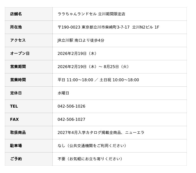 ランドセルメーカーの株式会社羅羅屋(本社:埼玉県川口市、代表取締役:安東裕子、以下「羅羅屋」)は、2026年2月19日(木)、東京都立川市に「ララちゃんランドセル 立川期間限定店」をオープンいたします。本出店は東京エリア初となる直営店であり、2027年度4月ご入学向けランドセルを、実物でじっくりと比較・体験いただけるショールームとなります。