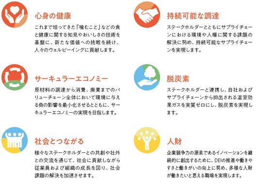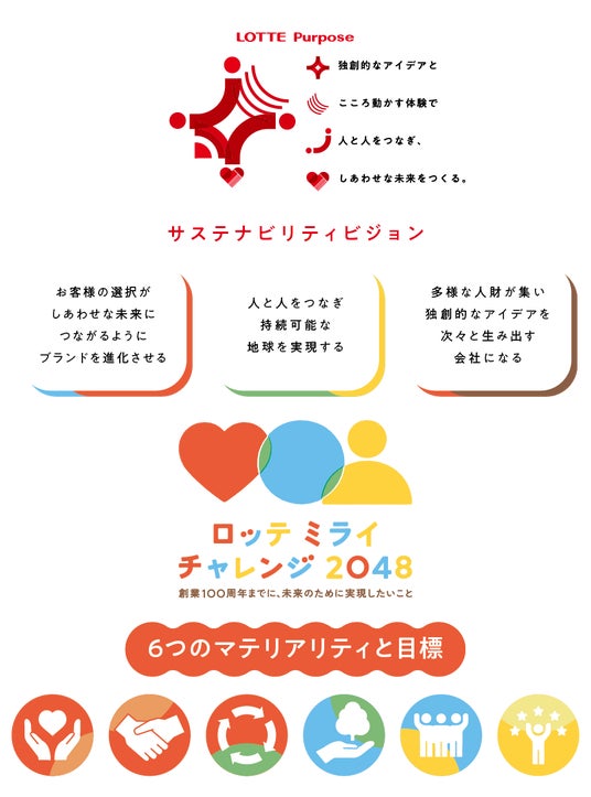 ロッテでは、ロッテパーパス「独創的なアイデアと こころ動かす体験で 人と人をつなぎ、しあわせな未来をつくる。」を根幹に、3つのサスティナビリティビジョンを実現するため、「ロッテ ミライチャレンジ2048」という目標を掲げています。社会と当社にとっての重要性から、以下の6つのマテリアリティ(重要課題)を制定し、これらを基にESG中期目標を設定しています。