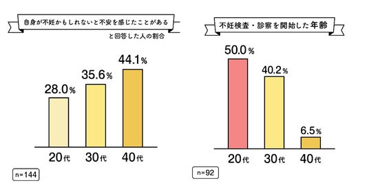 ・「自身が不妊かもしれないと不安を感じたことがある」と回答した人は、20代で28.0%、30代で35.6%、40代で44.1%という結果で、年代が上がるにつれて不安を感じる人が多いことが判明。また、不妊治療を受けた経験がある人の中では、20代で治療を開始した割合が半数を占め、最も多い結果に。