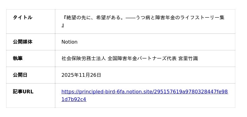 障害年金の不支給率が精神・発達障害で2倍に増加する中、うつ病特化の障害年金専門として2,500名超を支援してきた社会保険労務士法人 全国障害年金パートナーズ(東京都千代田区、代表:宮里竹識)は、「制度の向こう側にいる人々の実像」を伝えるライフストーリー集『絶望の先に、希望がある。』を2025年11月26日(水)に公開しました。