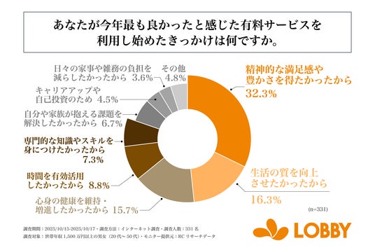 続いて、「今年最も良かったと感じた有料サービスを利用し始めたきっかけ」を尋ねる設問への回答では、1位が「精神的な満足感や豊かさを得たかったから」で32.3%、2位が「生活の質を向上させたかったから」で16.3%、3位が「心身の健康を維持・増進したかったから」で15.7%という結果になりました。この結果から、今年最も良かったと感じた有料サービスを利用し始めたきっかけとして最も多いのは「精神的な満足感や豊かさを得たかったから」であることが判明しました。