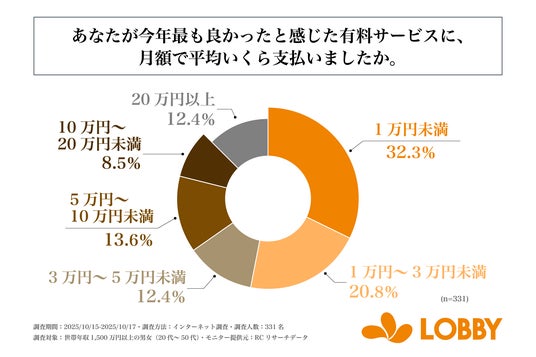 世帯年収1,500万円以上の男女の半数以上が、今年最も良かったと感じた有料サービスに対する月々の平均支払い額は「3万円未満」と回答