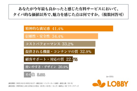 次に、「今年最も良かったと感じた有料サービスにおいて、タイパ的な価値以外で、魅力を感じた点」を尋ねる設問への回答では、1位が「精神的な満足感」で41.4%、2位が「信頼性・安全性」で34.4%、3位が「コストパフォーマンス」で33.2%という結果になりました。この結果から、今年最も良かったと感じた有料サービスにおいて、世帯年収1,500万円以上の男女の4割以上が、タイパ的な価値以外で魅力を感じた点は「精神的な満足感」であることがわかりました。