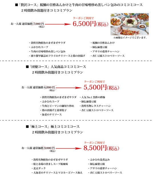 3コースとも2時間飲み放題付きコミコミプラン※仕入れ状況により、一部メニューが変更となる場合がございます。