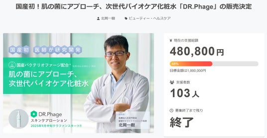 クラウドファンディングで100人を超える支援を集めた、肌の悪玉菌へアプローチする「DR.Phageスキンケアローション」が2025年11月より株式会社DR.Phage(本社:東京都新宿区、代表取締役:北岡一樹)から一般販売開始。