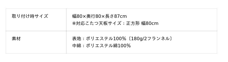 本製品には、抗菌防臭加工を施しており、熱が籠り蒸れやすいこたつでも、汗や皮脂での嫌なニオイや菌の発生を抑えられます。また、ご自宅の洗濯機で丸洗い可能な為、気軽に洗濯して清潔にご使用いただけます。さらに、生地には洗濯耐久性に優れた中綿を使用しており、洗った後の中綿のヨレやごわつき・へたりを軽減し、長期間快適な使い心地を実感いただけます。