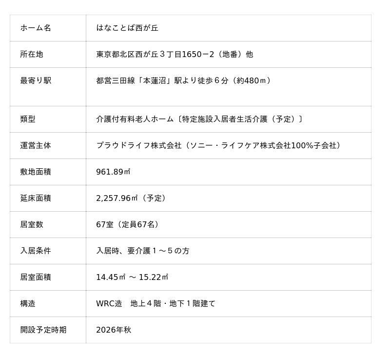ソニー・ライフケアグループの一員であるプラウドライフ株式会社(本社:神奈川県川崎市、 代表取締役社長 峰山 正樹)は、2026 年秋に、東京都北区において介護付有料老人ホームを開設することとなりましたので、下記の通りお知らせいたします。