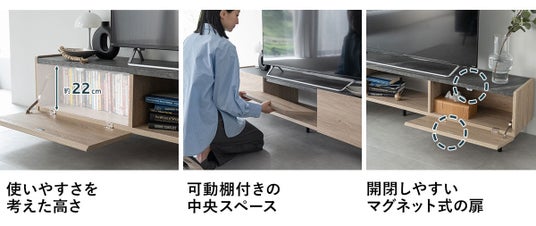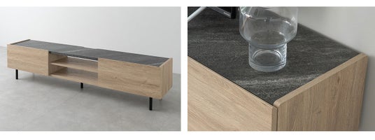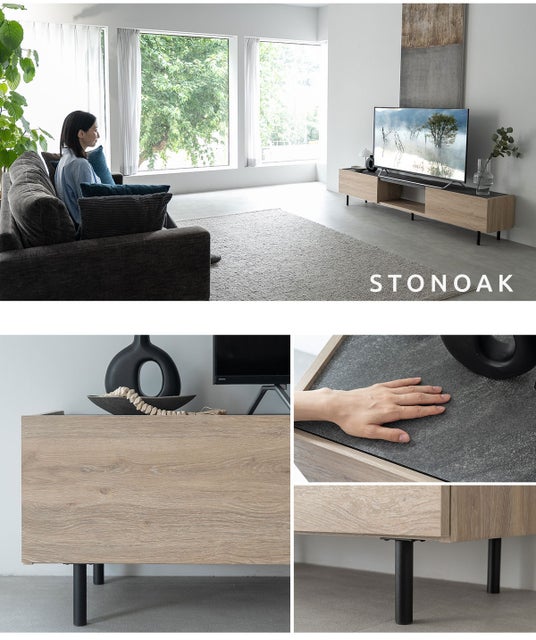 ブラックストーン調×オーク木目のツートンデザインは、置くだけでリビングを印象的な空間に。洗練された佇まいの美しさを、手ごろな価格で実現しました。