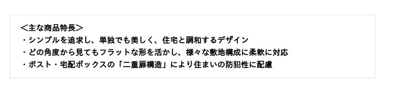 シリーズ第一弾となるポストユニットは住宅のエントランスに設置する、表札・インターホン、郵便ポスト・宅配ボックス、照明などを一体化した機能ポールです。必要な機能を一つの柱にまとめることで省スペース化や外観の統一感、利便性、防犯性の向上等の様々なメリットがあります。近年の住宅はオープン外構とシンプルな外観デザインの増加により、住まいの利便性とトレンドを同時に叶える需要が高まっています。そこで住宅のエントランスに必要な機能を集約しながらトレンドである水平・垂直基調のフォルム、洗練されたディテールで住宅に調和するアイテムとして「オルフェス ポストユニット」をラインアップしました。