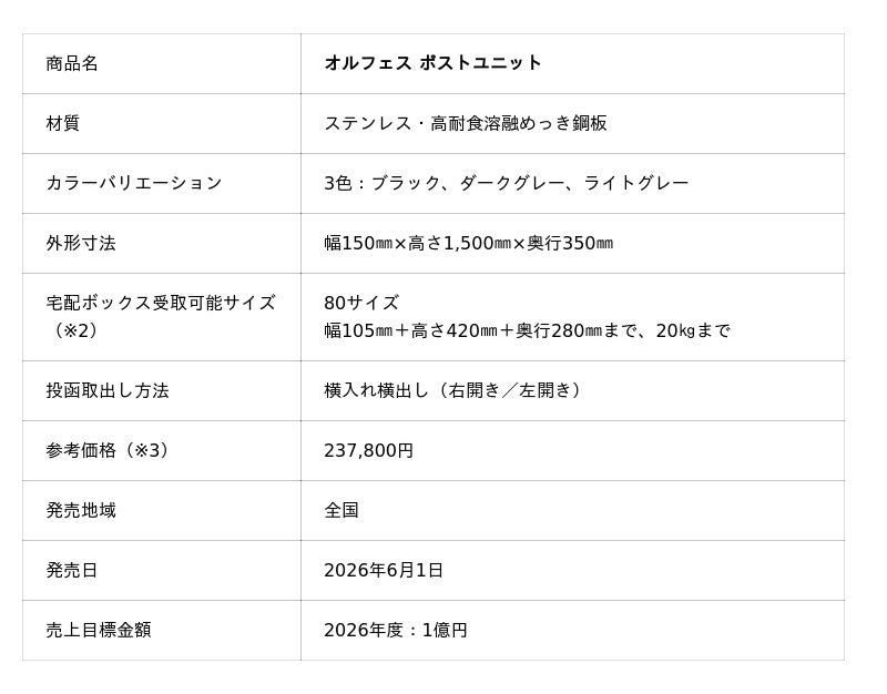 YKK AP株式会社(本社:東京都千代田区、社長:魚津 彰)は、エクステリア商品シリーズに「オルフェス (allFACE)」を新たに設定しました。「オルフェス」は住宅の顔となるシンプルなデザインのファサード(※1)を演出する商品シリーズです。シリーズの第一弾として、水平・垂直基調のスクエアなフォルムと洗練されたディテールを実現した、郵便ポスト・宅配ボックス一体型機能ポール「オルフェス ポストユニット」を6月1日から発売します。