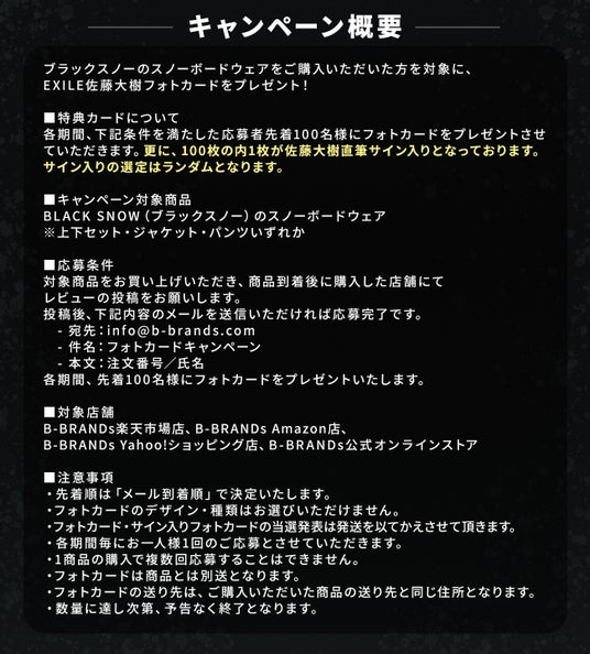 2025年11月18日(火)より、BLACK SNOW(ブラックスノー)のスノーボードウェアを公式ストアB-BRANDs(ビーブランズ)にて購入した人の中から先着100名で、限定フォトカードがもらえるキャンペーンがスタート。