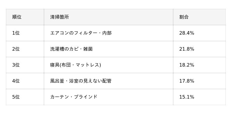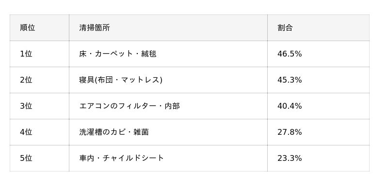産前は赤ちゃんが直接触れる「床・カーペット」(46.5%)や「寝具」(45.3%)が気になる一方、実際に育児が始まると「エアコン内部」(28.4%)、「洗濯槽」(21.8%)、「風呂釜・浴室配管」(17.8%)など、目に見えない場所の汚れに気づきやっておけばよかったと感じることがわかりました。