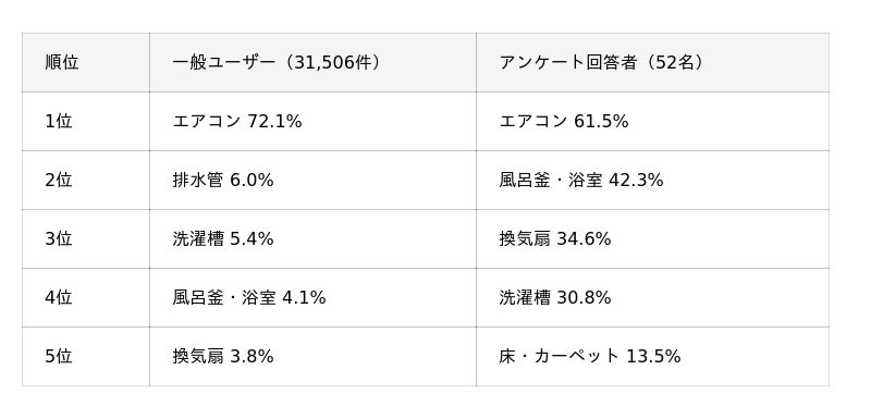 特に注目されるのは「風呂釜・浴室」クリーニングです。一般ユーザーでは依頼割合がわずか4.1%である一方で、アンケート回答者は実に42.3%が依頼しており、子育て世帯では「風呂釜・浴室」が一般家庭に比べて圧倒的に重視されていることがわかりました。