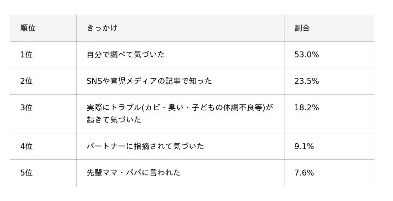 半数以上(53.0%)が「自分で調べて」産後に見えない場所の重要性に気づいており、SNSや育児メディア(23.5%)も含めると、約8割が情報収集を通じて必要性を認識していることがわかりました。