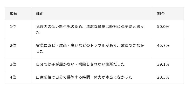 - 「免疫力の低い新生児のため、清潔な環境は絶対に必要だと思った」(50.0%)