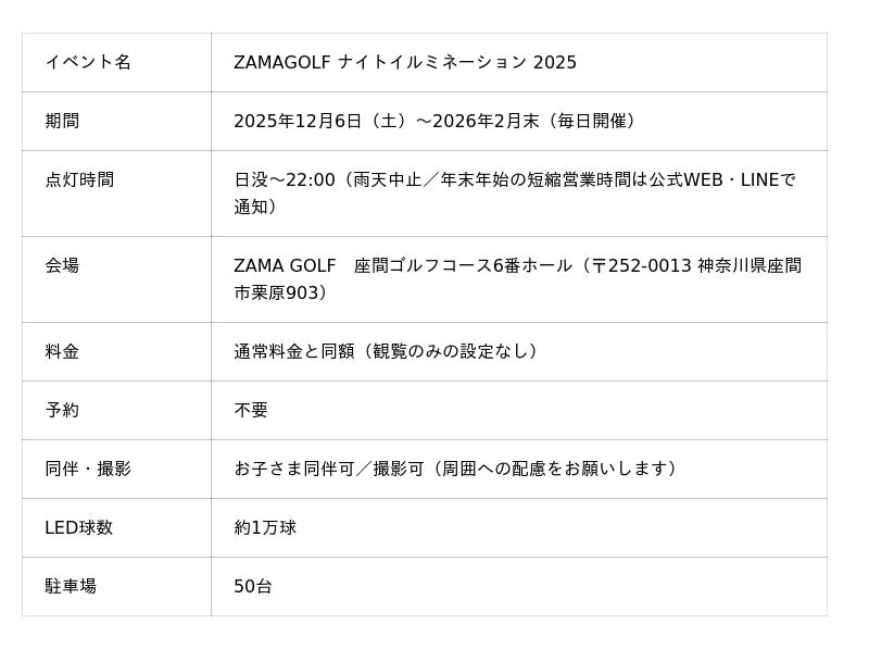 座間ゴルフ練習場(神奈川県座間市、以下ZAMAGOLF)を運営する草光建設株式会社は、ショートコース6番ホールで『ZAMAGOLF ナイトイルミネーション 2025』を開催します。