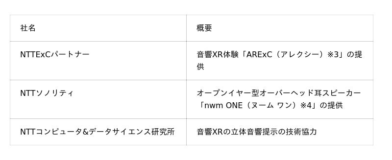 「音響XR」は、空間上の音源を仮想的に3次元的に配置して、現実の環境音とバーチャル空間の音とを自然に融合させるNTTグループの音響技術です。「音響XR」がデジタル上の仮想世界の演出に加わることにより、参加者は、あたかもキャラクターが実際にそこに存在しているような、立体的な聴覚体験ができます。今回は、NTTソノリティが提供するオープンイヤー型オーバーヘッド耳スピーカー「nwm ONE(ヌーム ワン)」を用いた新たな演出として、会場のスピーカーから流れる環境音とヘッドホンから流れる音の演出のそれぞれが、耳をふさぐことなく融合する聴覚体験を、期間限定でお楽しみいただけます。
