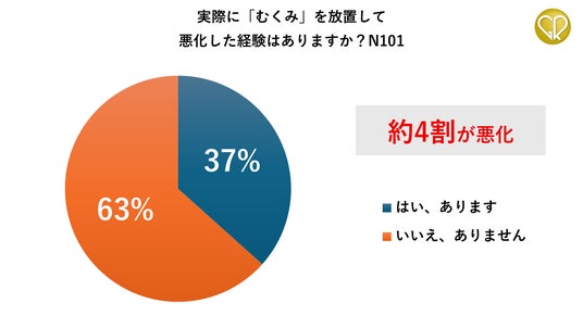 続いて「むくみを感じた事がない」方を除いた101人に対して、「実際に「むくみ」を放置して悪化した経験はありますか?」と質問したところ、「はい、あります」が37%(37人)、「いいえ、ありません」が63%(64人)という結果で約4割が「むくみを放置して悪化した」と回答しました。