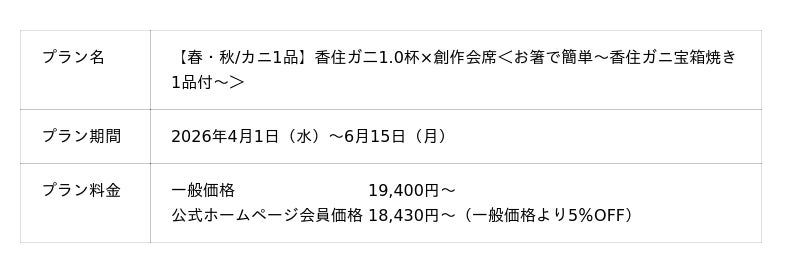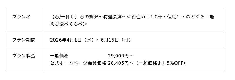 春のスタンダード会席をベースにしつつも、【春の味覚/香住ガ二1.0杯(宝箱焼き)】を味わえる期間限定のランクアッププランです。