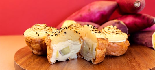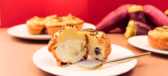 濃厚でなめらかなカスタードクリームに、低温でじっくりと焼き上げ、焼き芋にしてからペースト状にしたさつまいもを合わせ、食感のアクセントにダイス状のさつまいもを加えました。